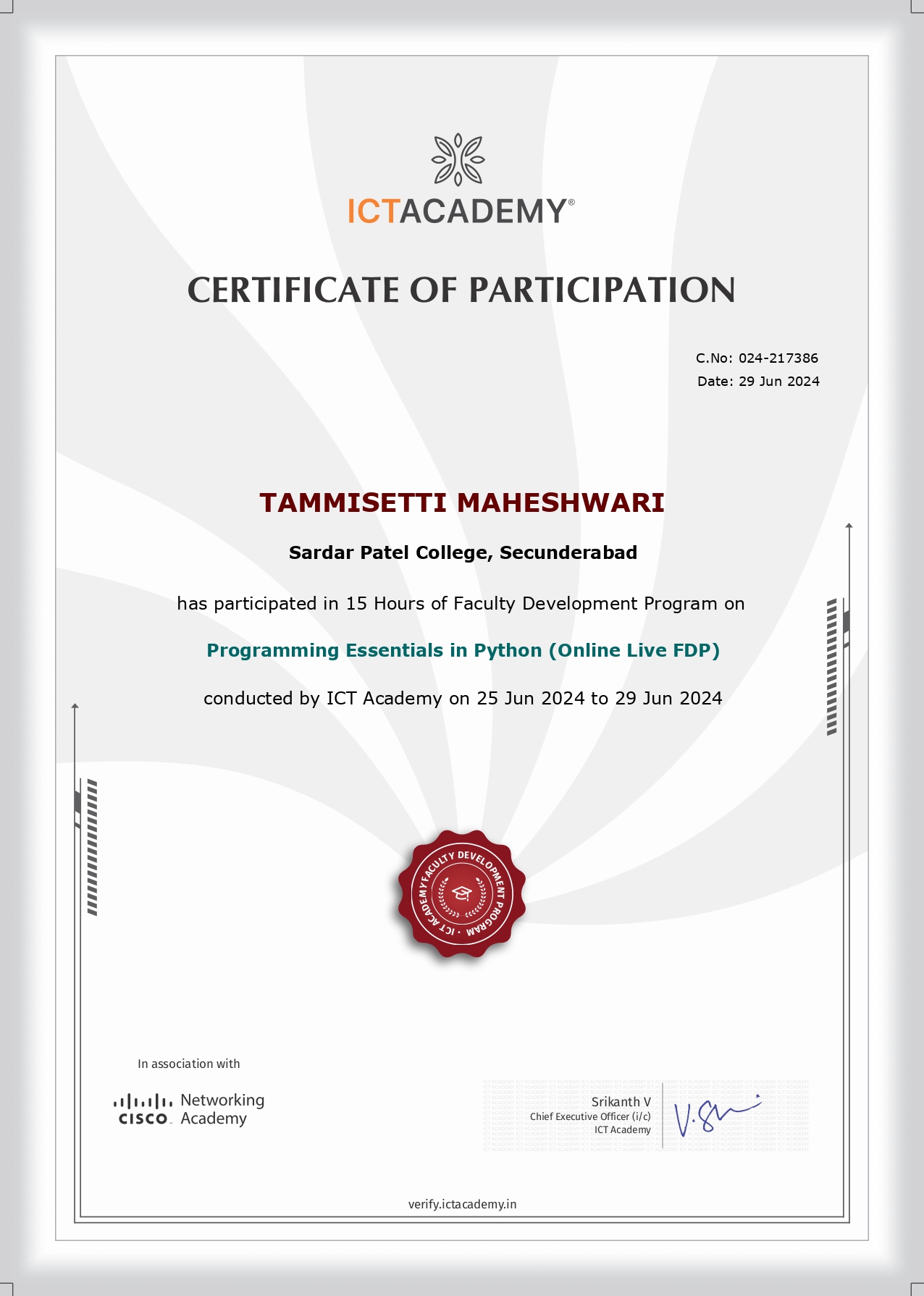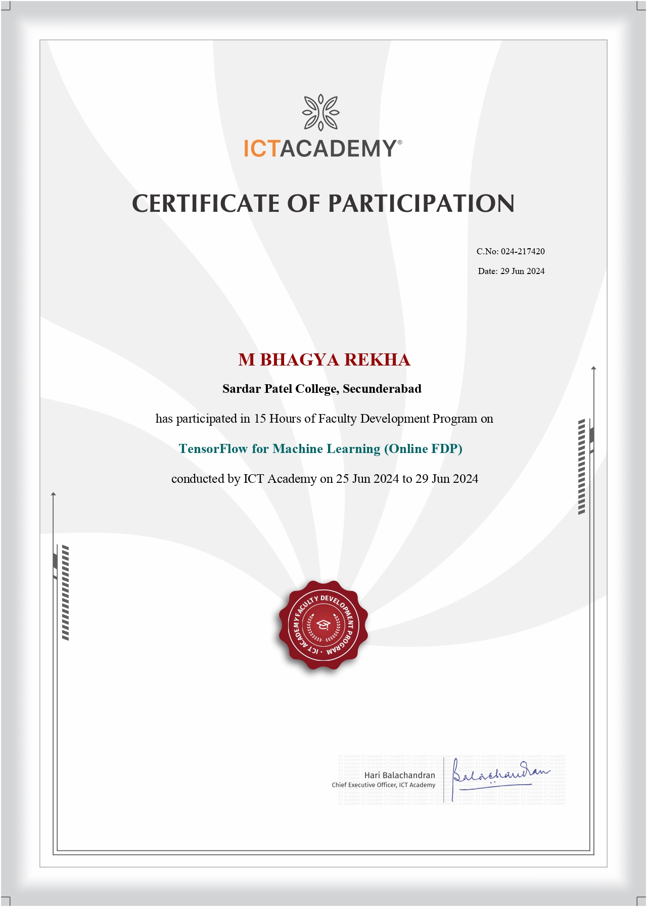 1. S.Sarala Devi and K. Radhika, Department of Computer Science attended online FDP on ―TensorFlow for Machine Learning‖ organized by ICT Academy from 17th to 21st March, 2025.
