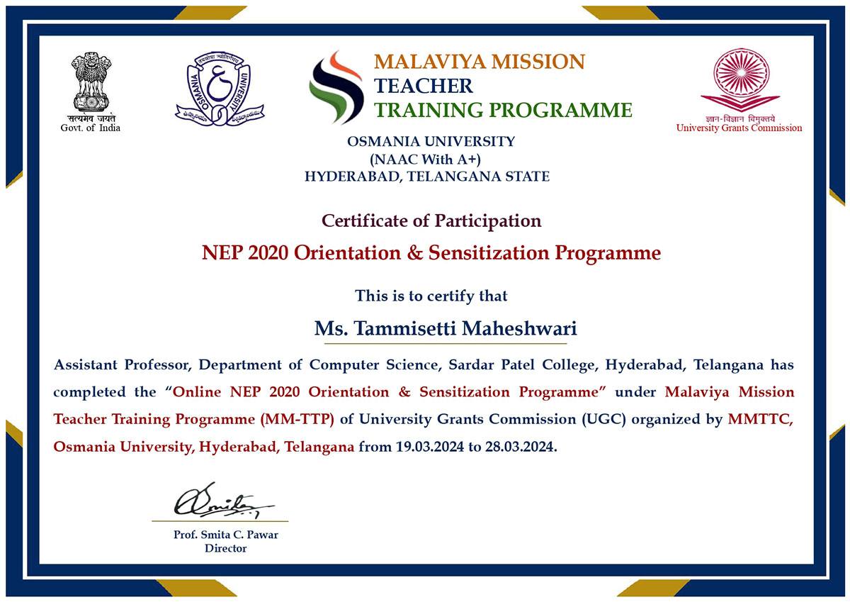 Arshiya Fatima, T.Maheshwari, Assistant Professors from computer science department have participated in FDP on “Programming